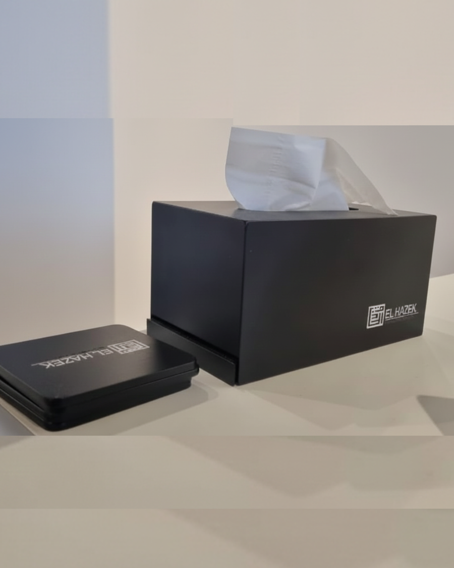 We created custom coasters and tissue boxes for El Hazek Construction, made from high quality MDF and coated with durable HPL for a sleek and long lasting finish. Adding their logo gave each piece a personalized touch while preserving the elegance and identity of the space, making them a perfect fit for offices and professional environments.
