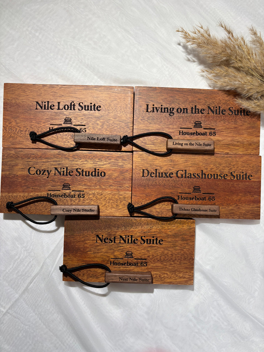 We made loft suite keychain holders from rich Walnut wood and suite signs from elegant Mahogany wood for House Boat.