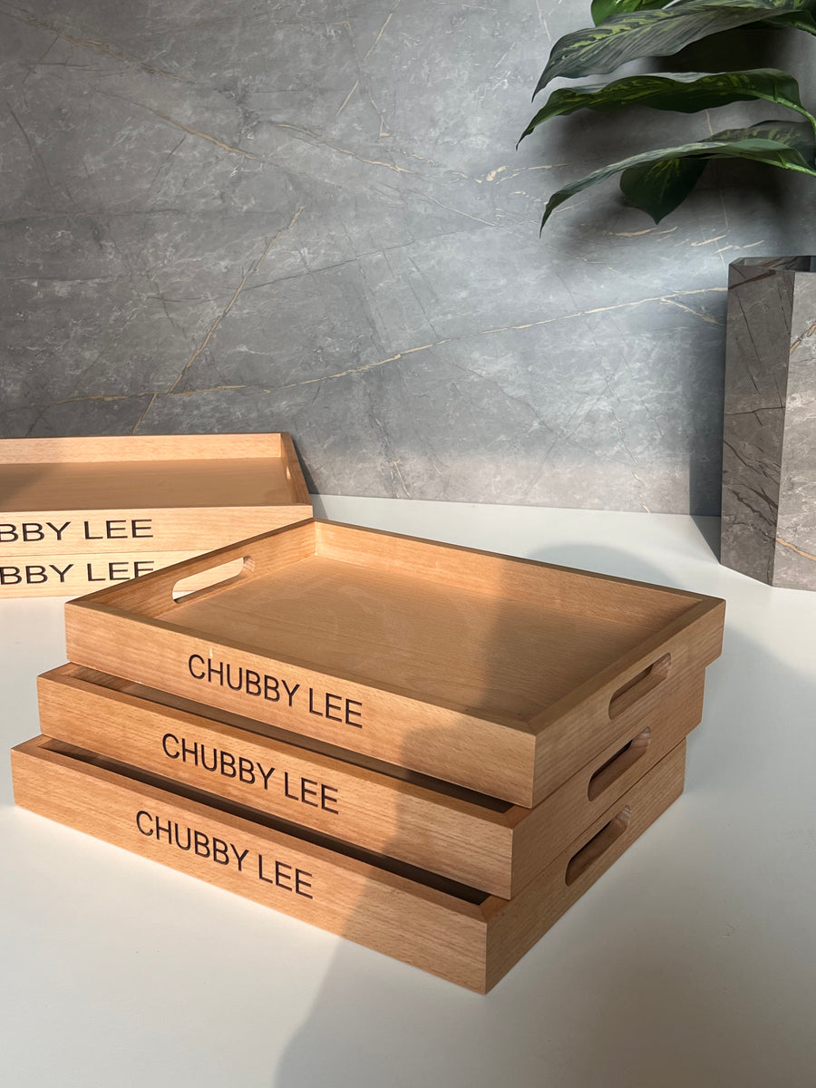 Custom solid Beech wood serving trays designed to complement the bold flavors of Chubby Lee.