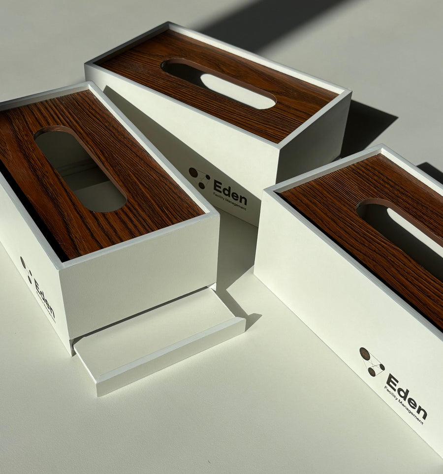 For Eden, we designed custom tissue boxes in carefully selected brand colors with an engraved logo to reflect their identity.
