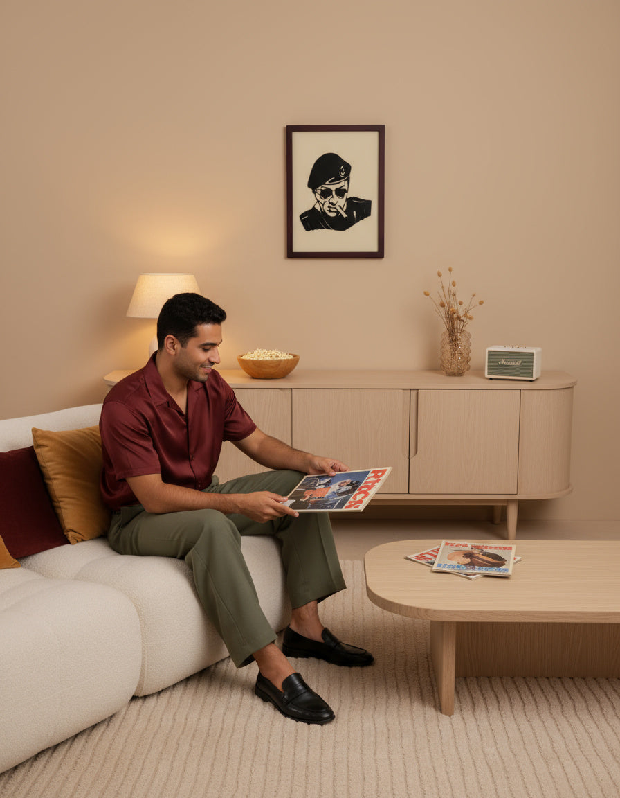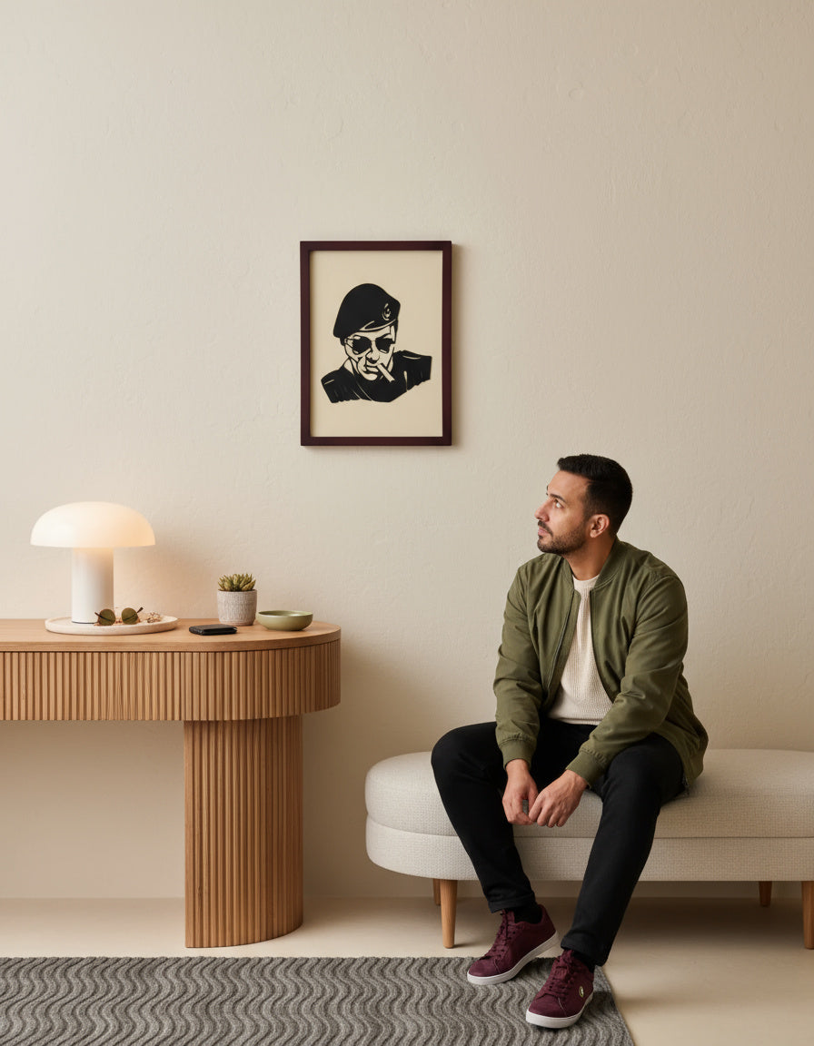 This striking wall art showcases a bold and iconic silhouette of a figure wearing a military beret and sunglasses, exuding a sense of strength and authority. The design is minimalistic yet powerful, with sharp contrasts that highlight the figure's strong posture and the cigarette in hand. The monochromatic color scheme in black and beige gives the artwork a timeless, classic feel. This piece is perfect for those who admire resilience, leadership, and a touch of rebellious attitude. Ideal for modern, edgy spaces, it makes a strong statement while adding personality and character to any room.